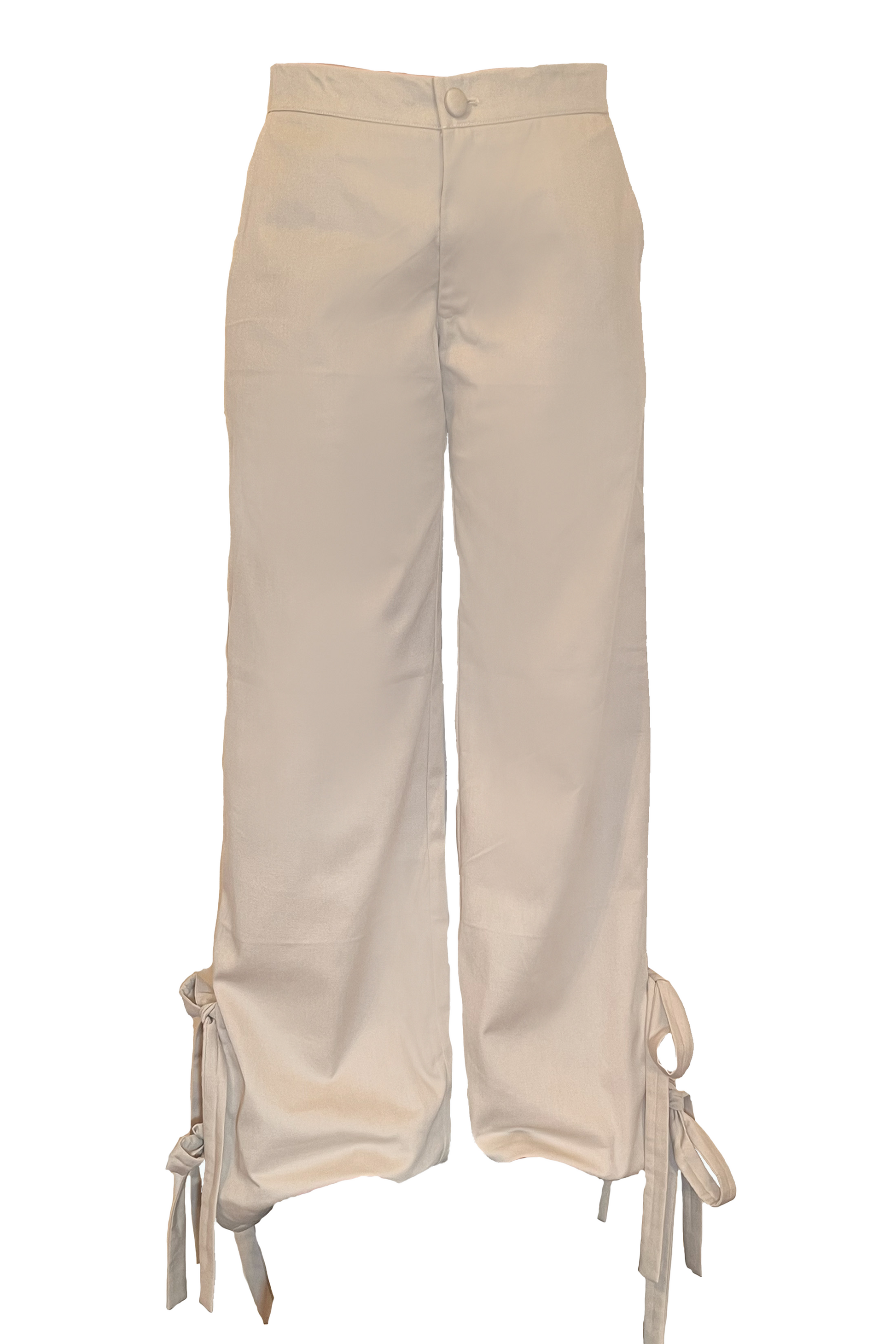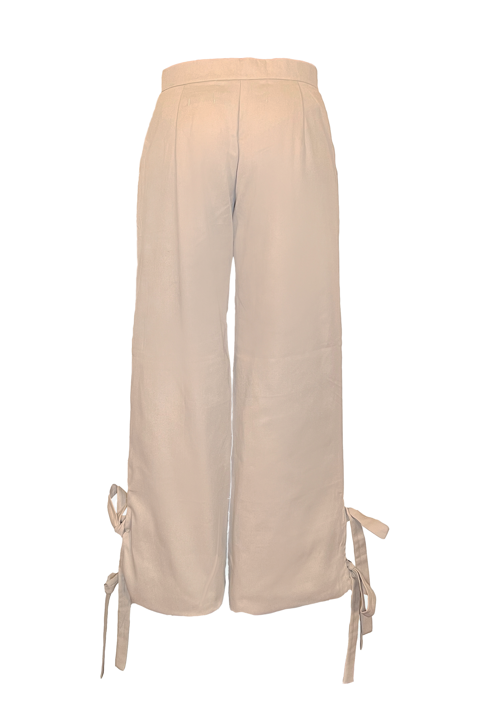 Low rise wide leg pants with open side detailing and adjustable ties for versatility styling. Two side pockets and fitted waistband.