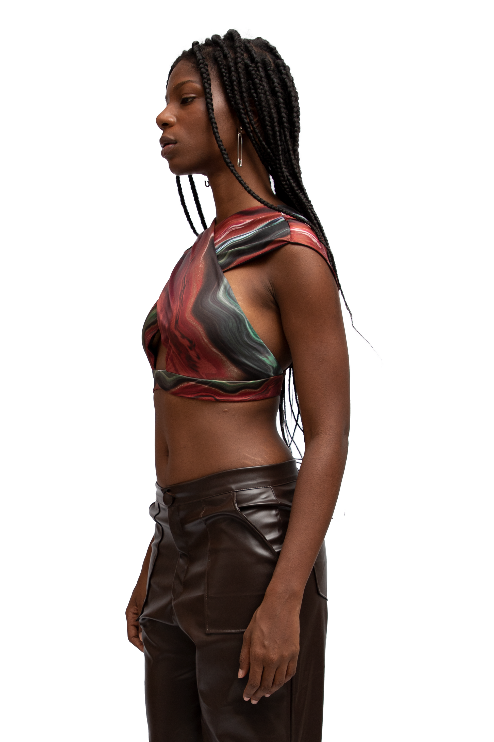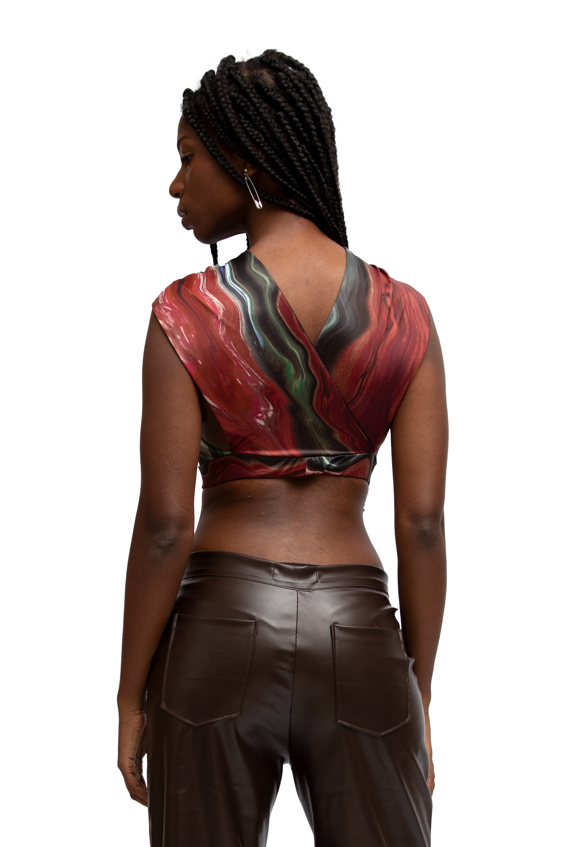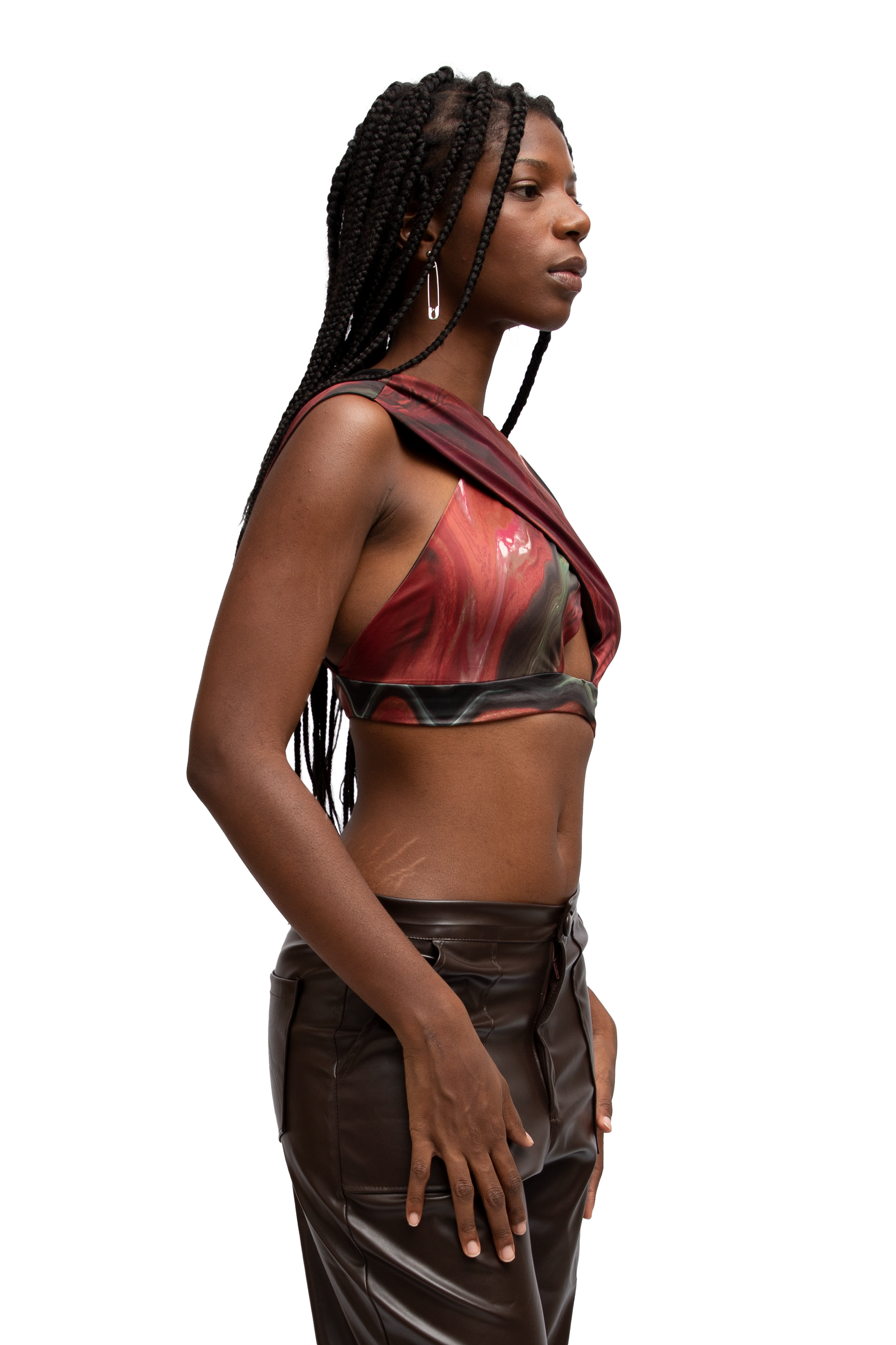 Sleeveless stretchy crossover top with an elasticated chest band. Lined.
