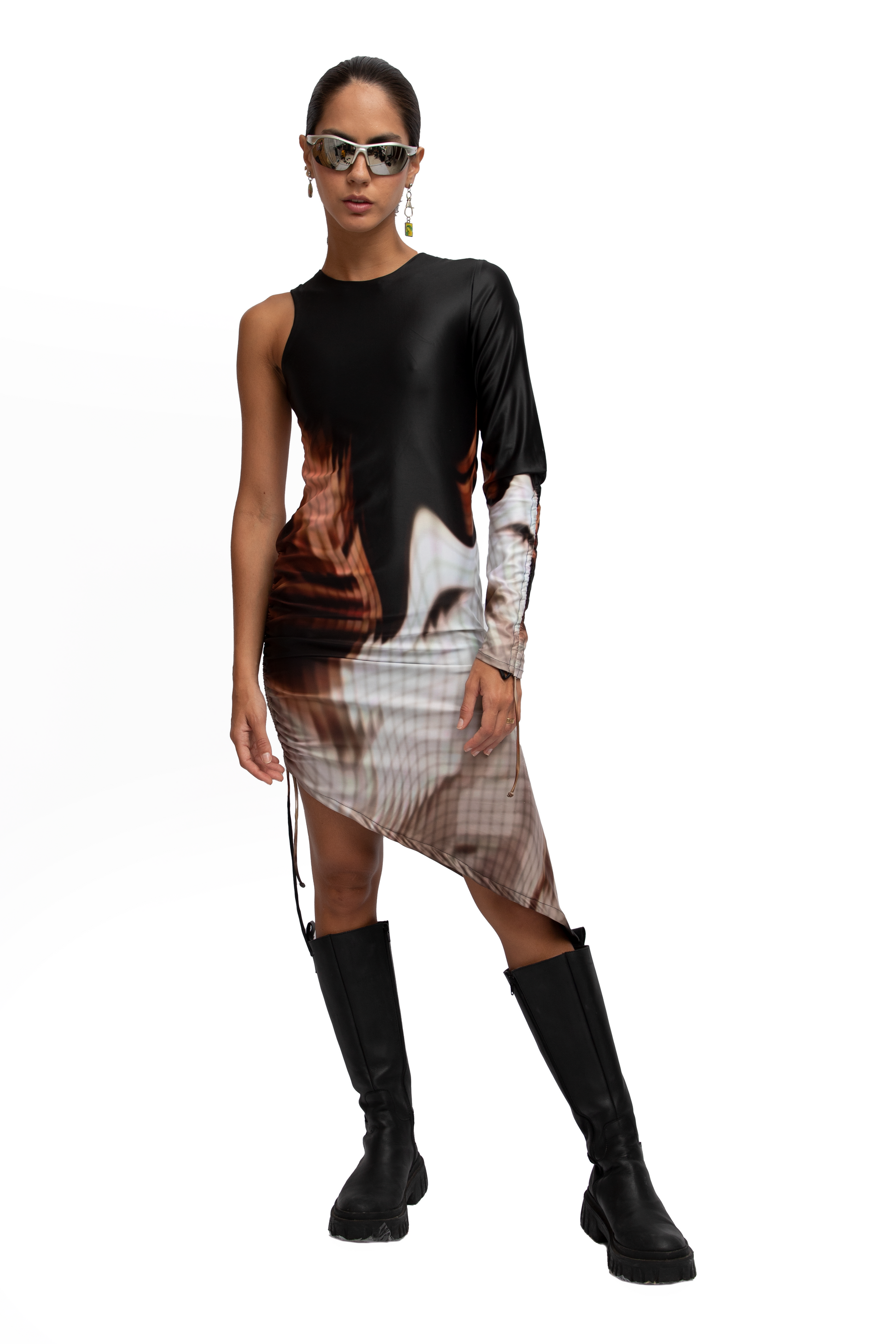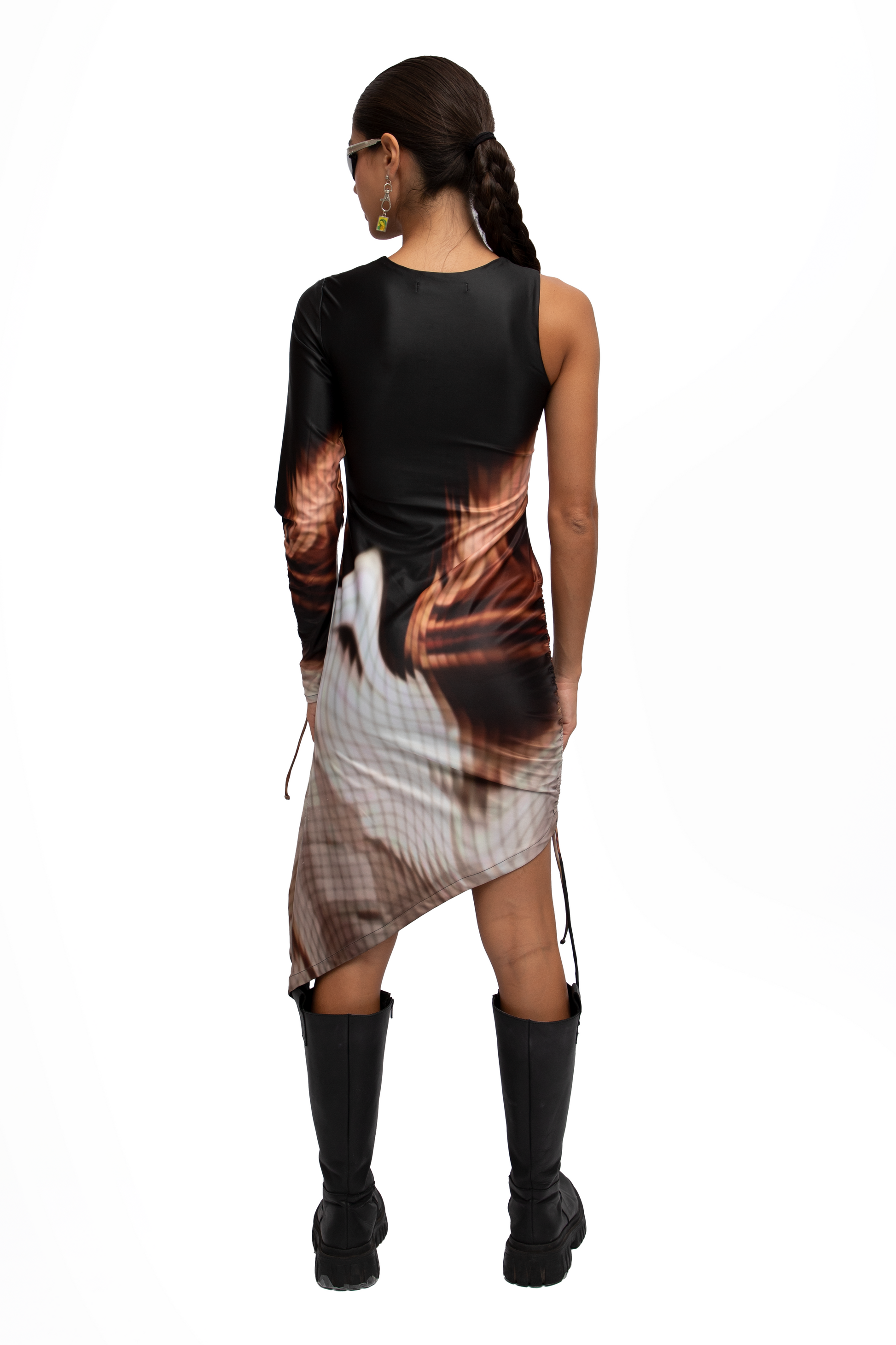 Stretchy fabric midi dress featuring an adjustable side scrunch at waist level and also elbow level. Fitted in style.