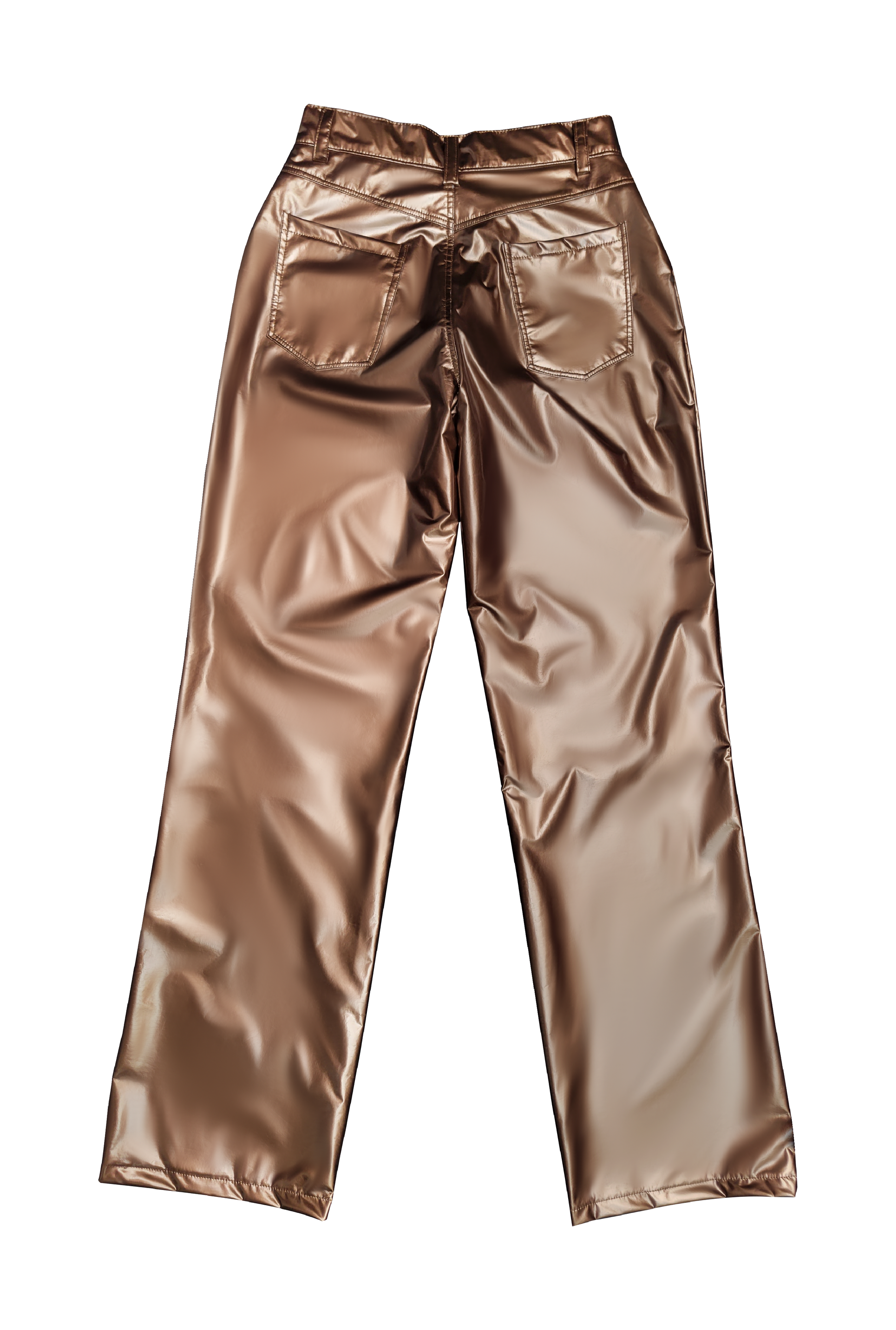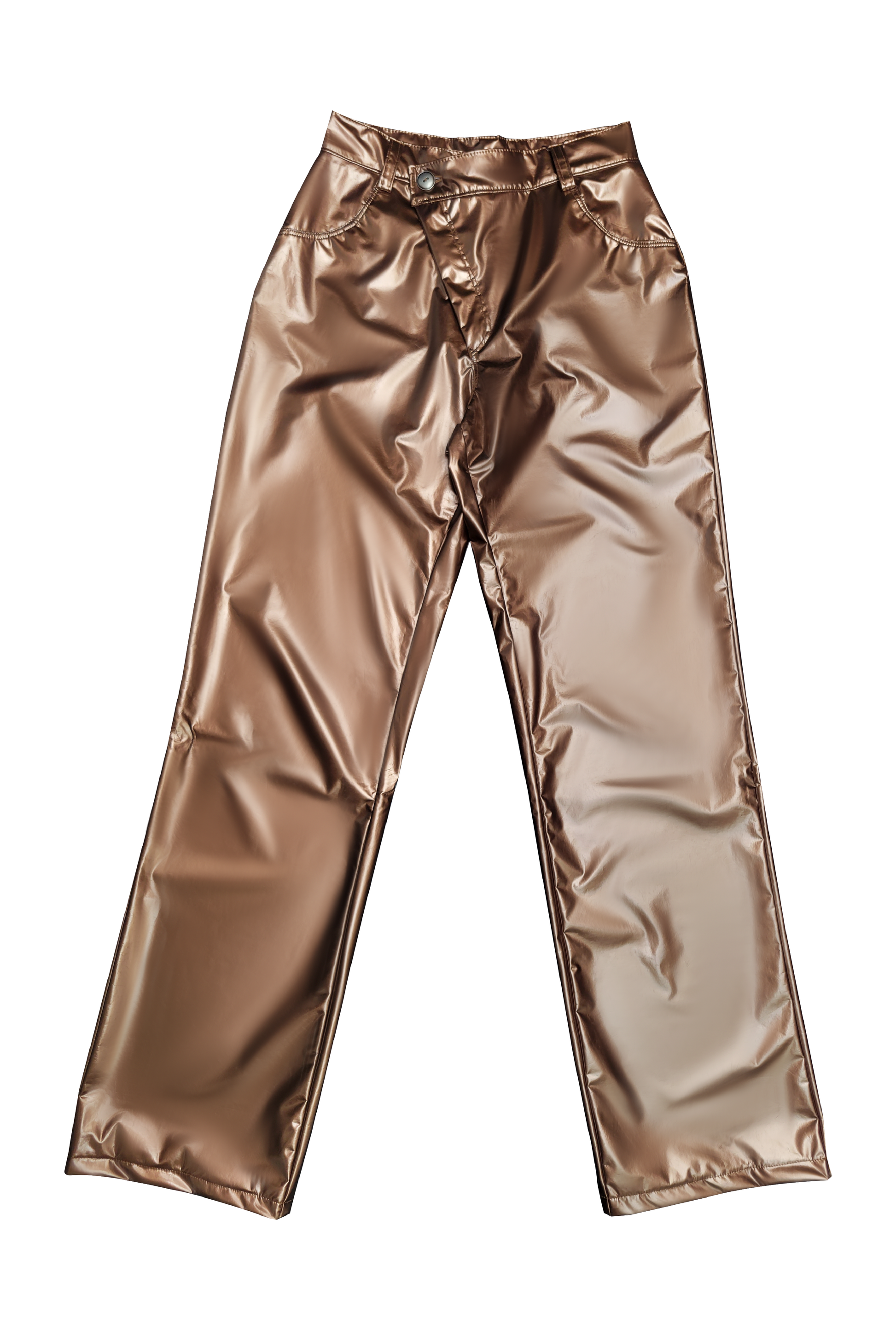 Patent leather bronze pants featuring an asymmetrical waistband. High-rise.