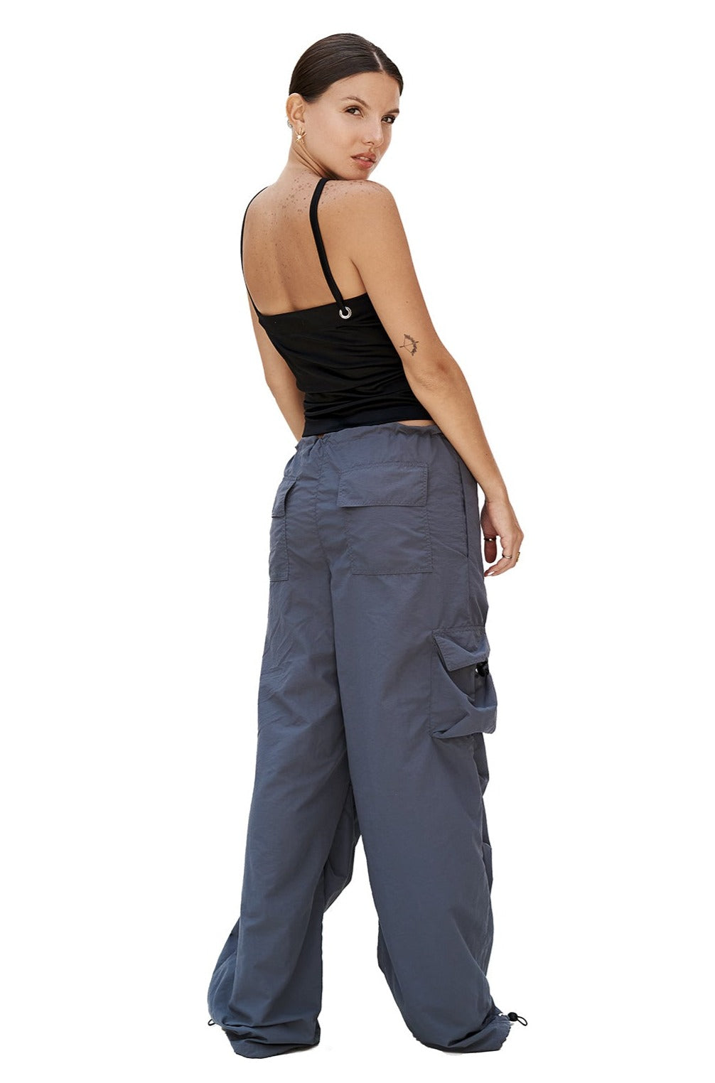 Pantalones cargo tipo paracaídas. Se puede usar tanto de tiro bajo como de tiro alto gracias a su cintura ajustable. También ajustable al nivel del talón. Ajuste de gran tamaño. Bolsillos laterales externos. Disponible en negro y gris.