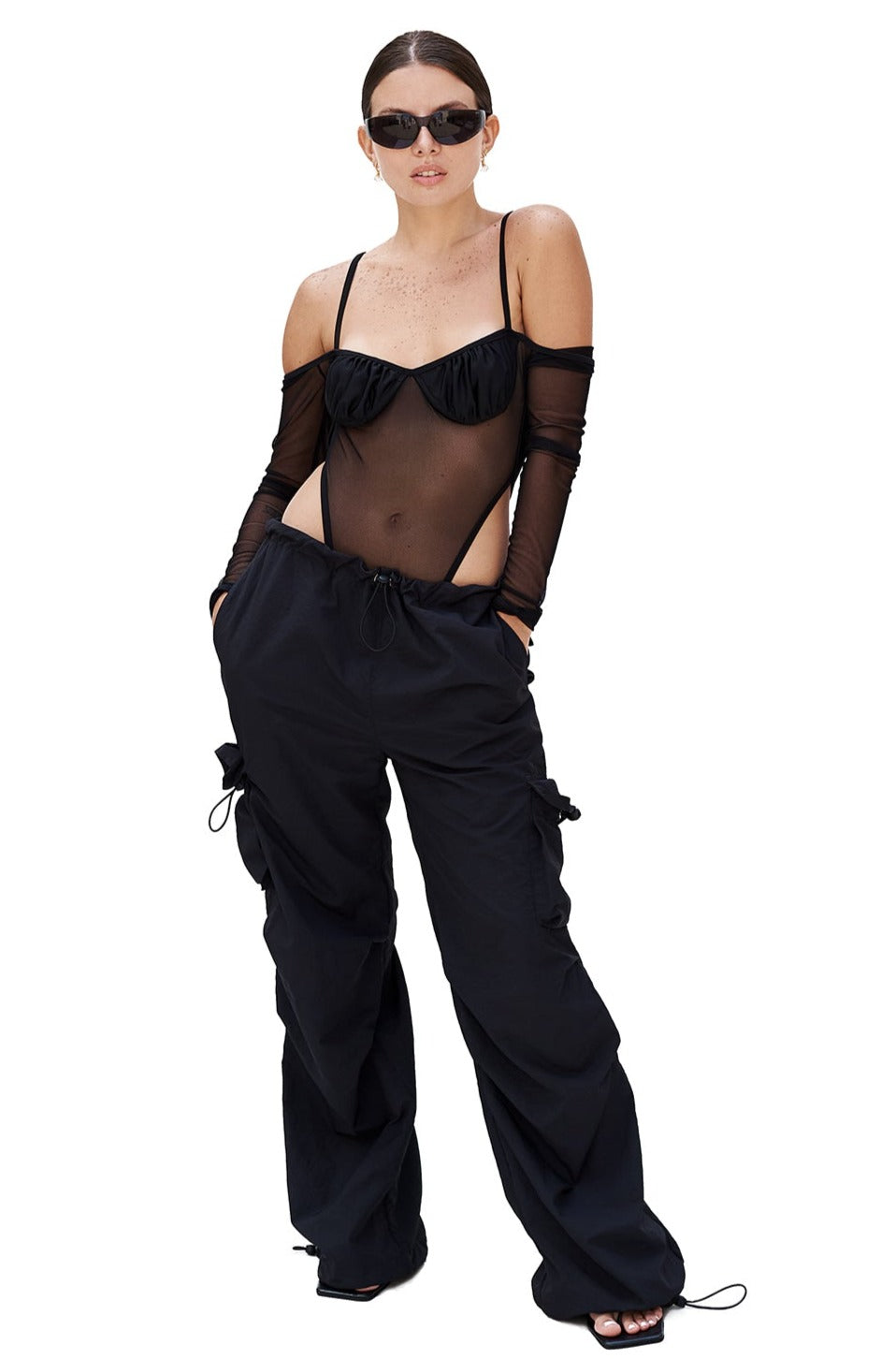 Pantalones cargo tipo paracaídas. Se puede usar tanto de tiro bajo como de tiro alto gracias a su cintura ajustable. También ajustable al nivel del talón. Ajuste de gran tamaño. Bolsillos laterales externos. Disponible en negro y gris.