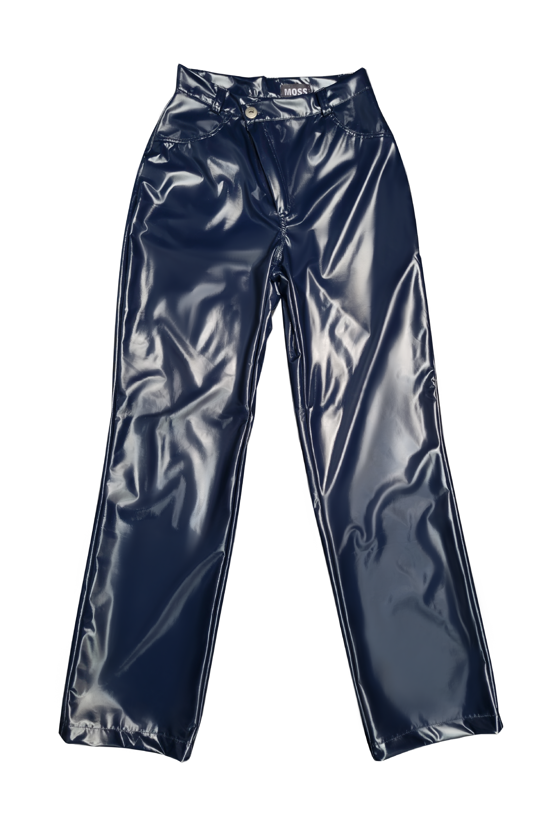 Patent leather navy blue pants featuring an asymmetrical waistband. High-rise.
