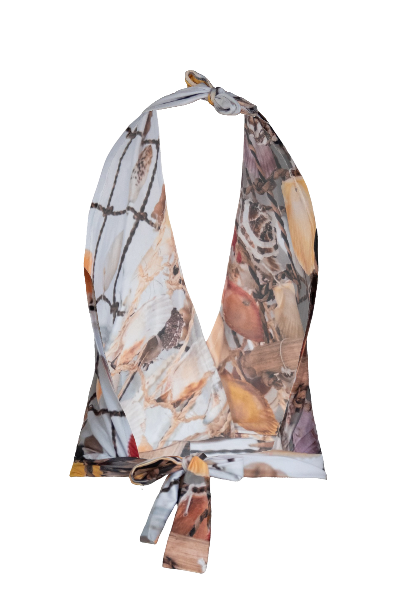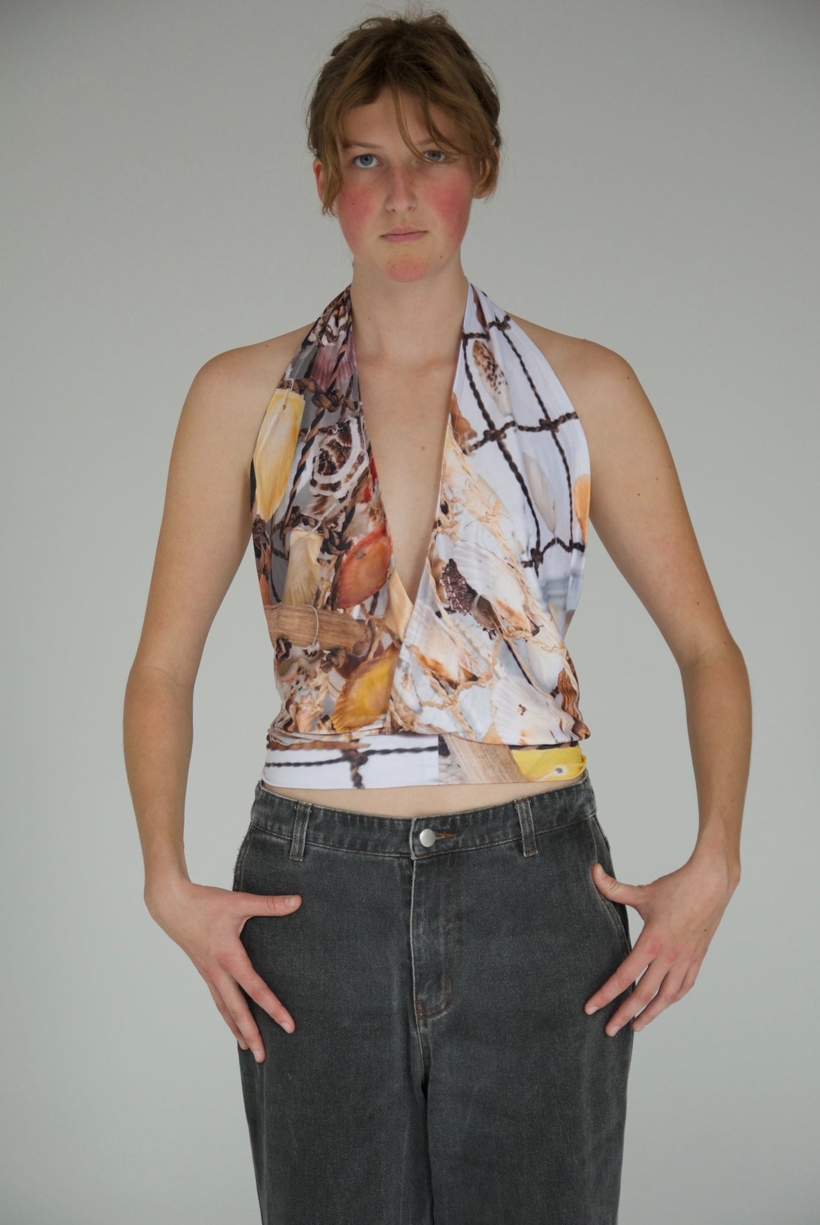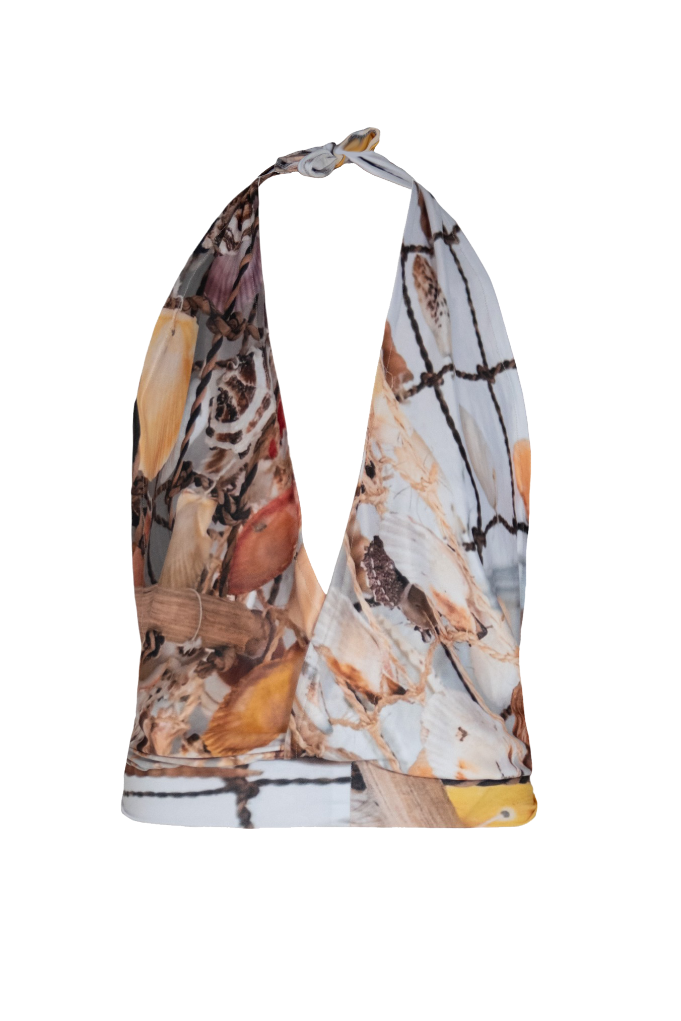 This relaxed-fit halter top ties at the neck, featuring an open back and a loose front for a breezy, elegant style.