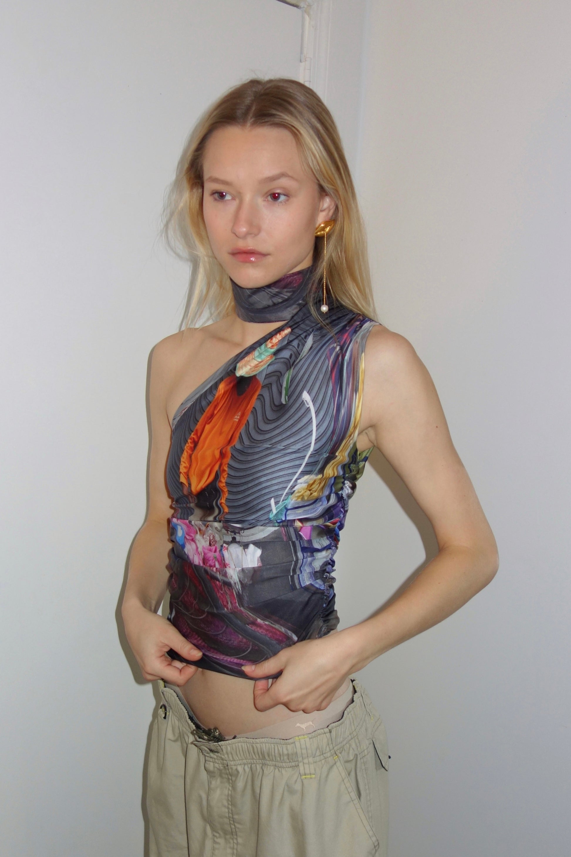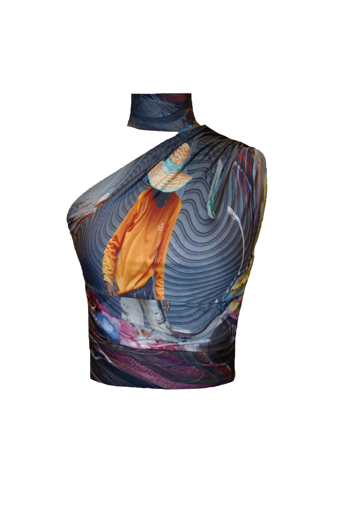 Introducing our avant-garde top, a fashion statement inspired by the mesmerizing print captured in the heart of a Bangkok street food market during a hot and humid summer.