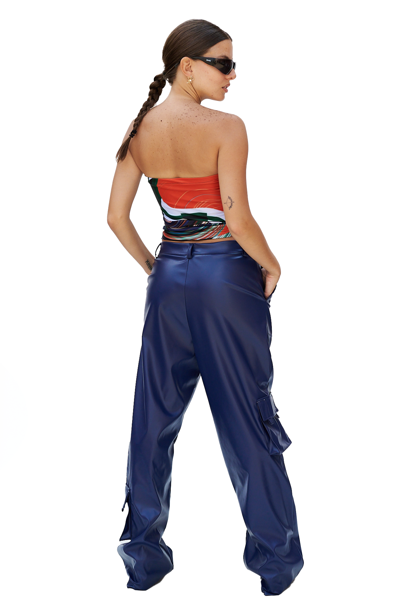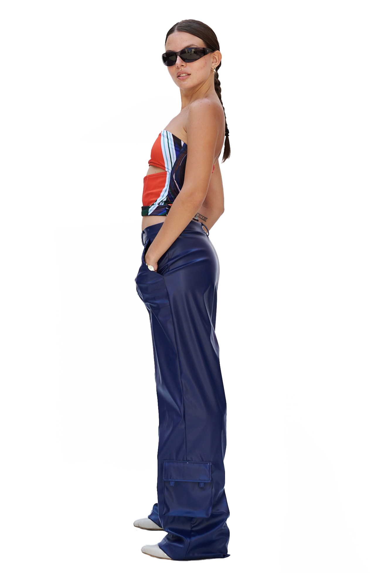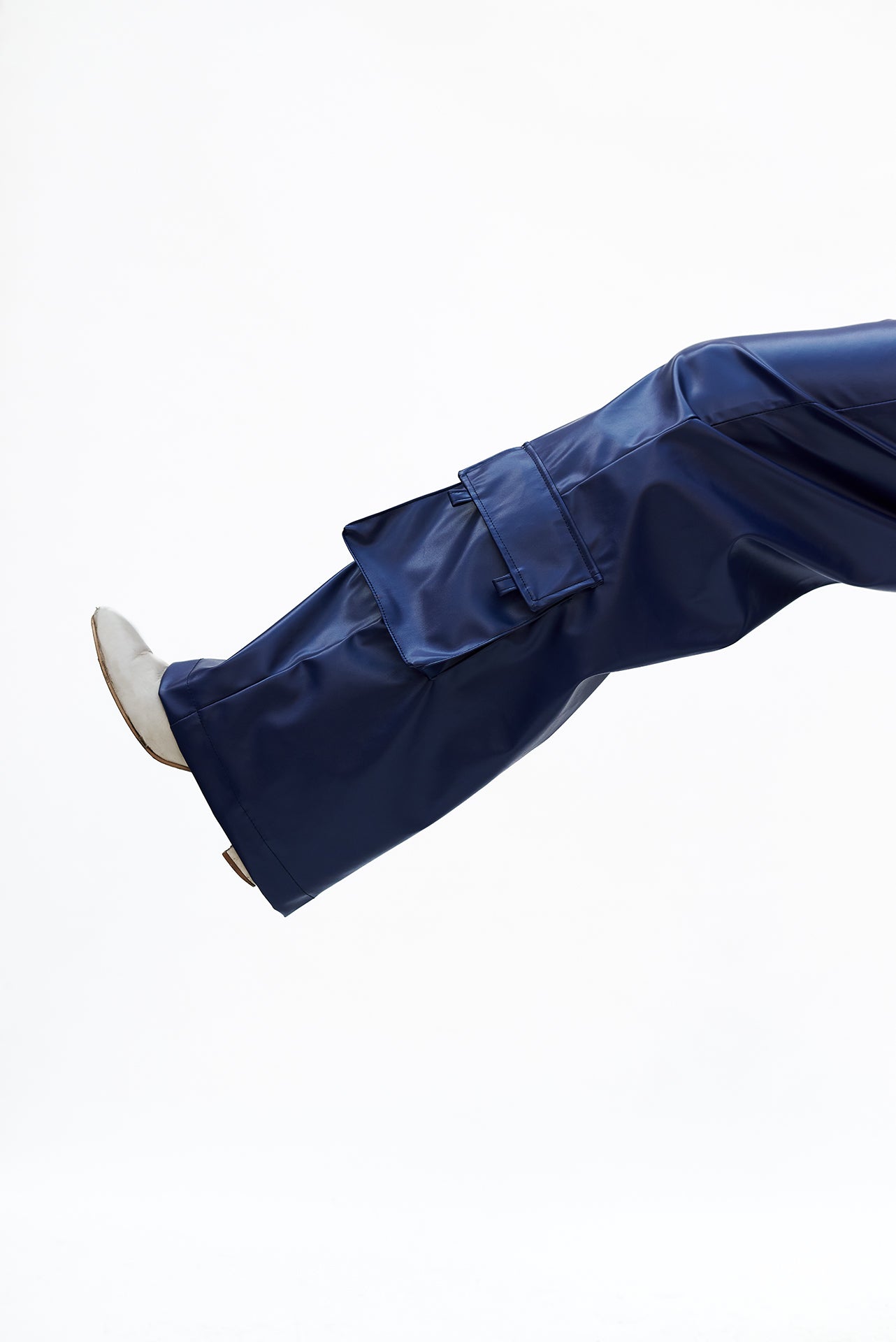Faux leather cargo pants featuring multiple front pockets. Multiple colors available. Due to its elasticity, it can be worn as both low rise and high rise. Oversized fit.