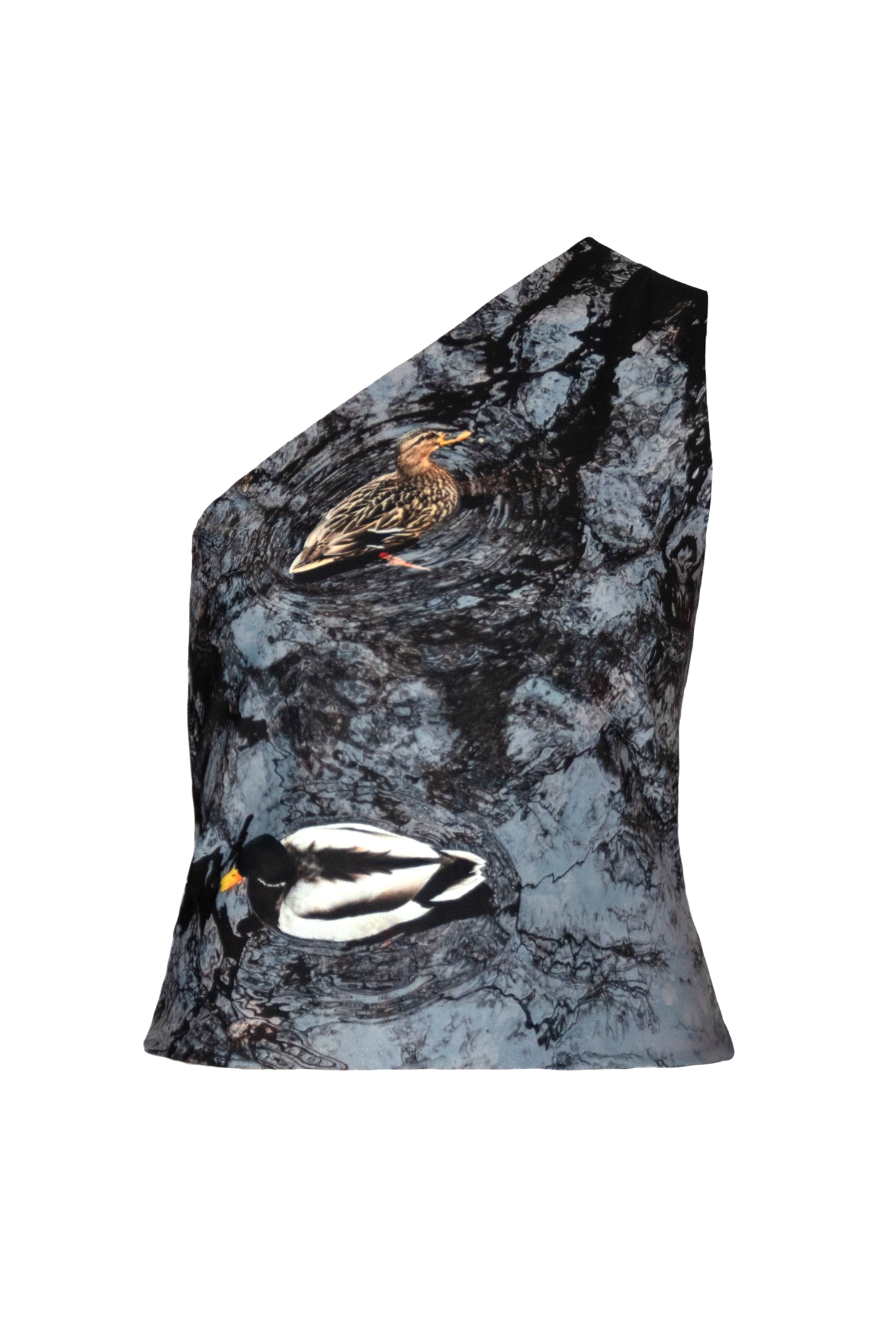 A modern, asymmetrical top made with recycled lycra, designed to provide a flattering fit with its soft, stretchy fabric.