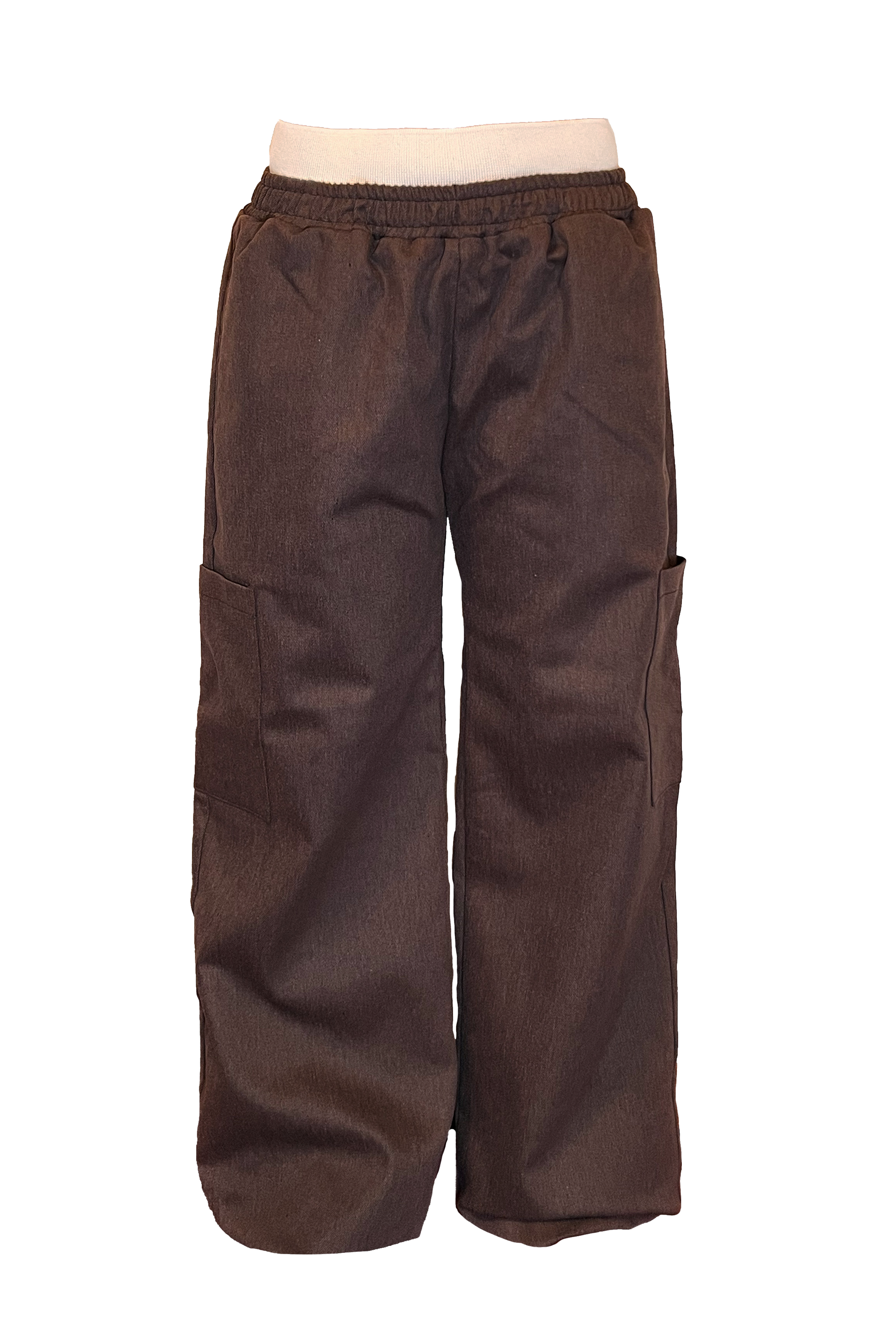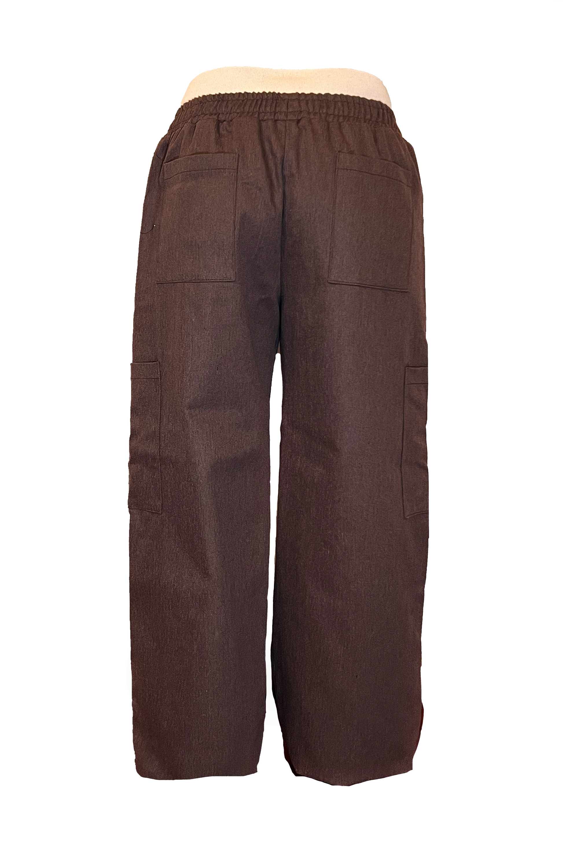 Loose fit cargo pants with double waistband and rib detailing for adjustable fit. this versatile pants can be worn low or high waisted. Features two extra large outside side pockets and two back pockets.
